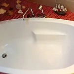 客房配备梳妆区,沙发和办公桌,在浴室里有坐浴盆,步入式淋浴间和浴缸.